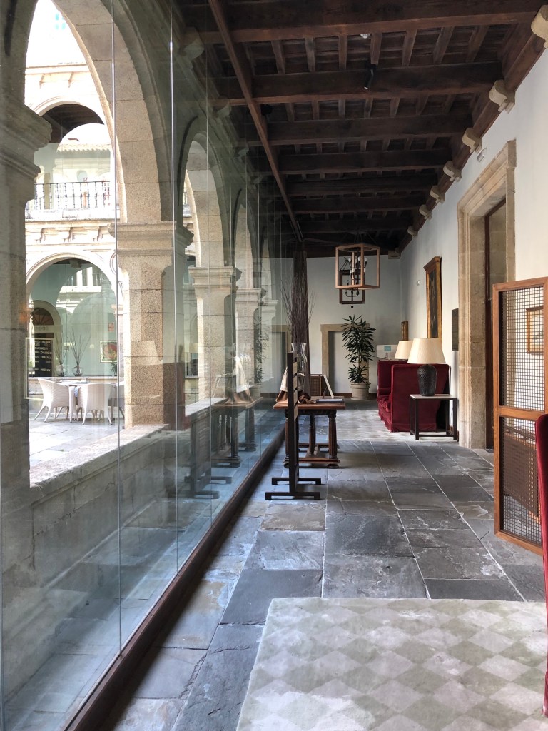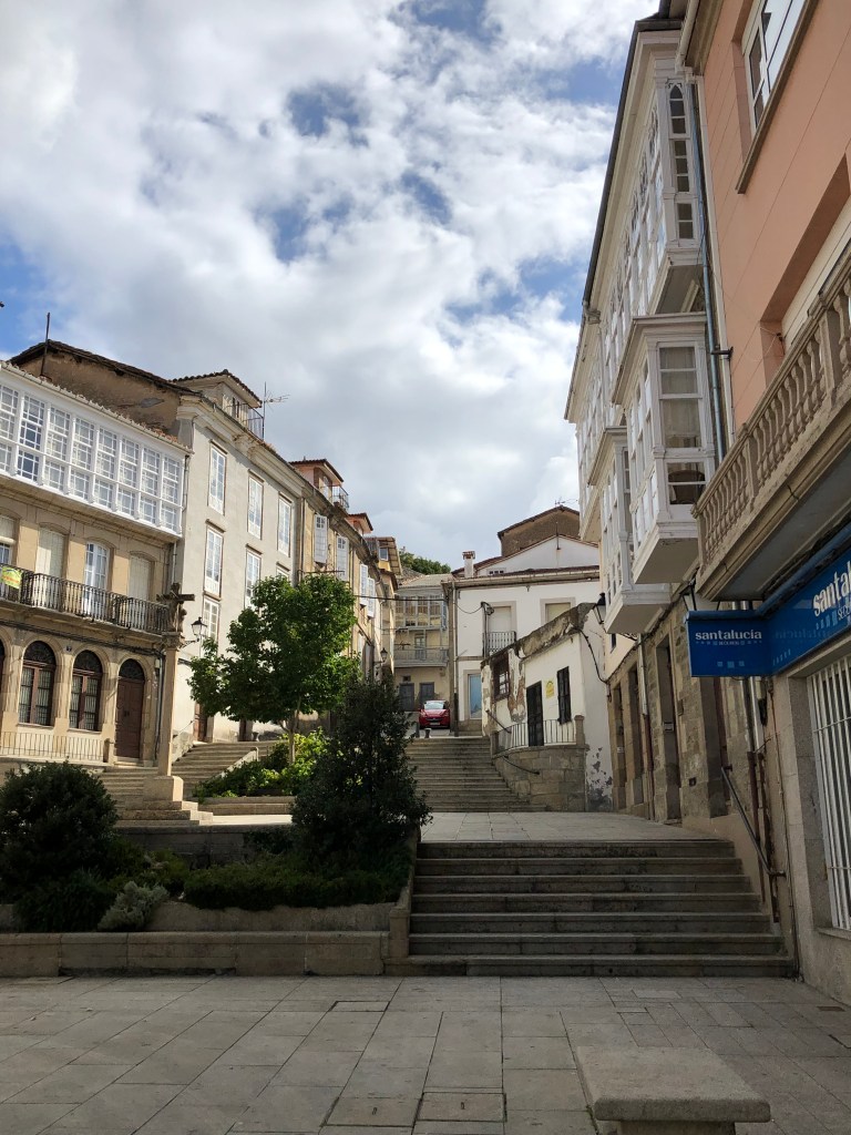 The night before starting the second week was a special treat, as I described in the prior post, a long restful sleep in one of Spain’s renowned “Paradores,” a convent that was now a luxury hotel, sitting high above the small city of Monforte de Lemos. While sleep was a highlight, a wonderful massage followed by a steak dinner (as opposed to the bread and ham I’d eaten most nights to say nothing of the stack of Pringles the night before) made the hotel stay especially memorable. So, on the morning kicking off week #2 I sleep in, knowing that it would be the second day in a row where I only had to cover ten miles. But first I indulge in a breakfast buffet, feeling more the tourist than the pilgrim. That ends soon as I pull on my backpack and begin the slow, careful descent of the very steep hill that towers over the city.