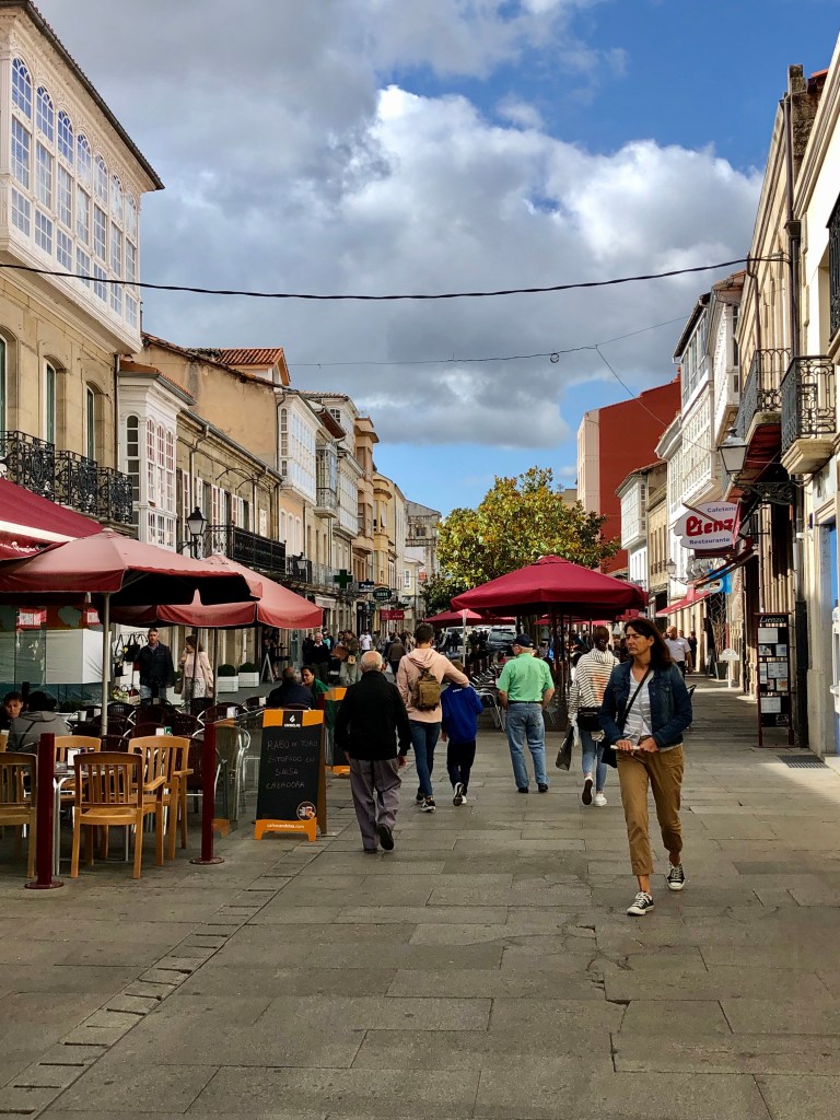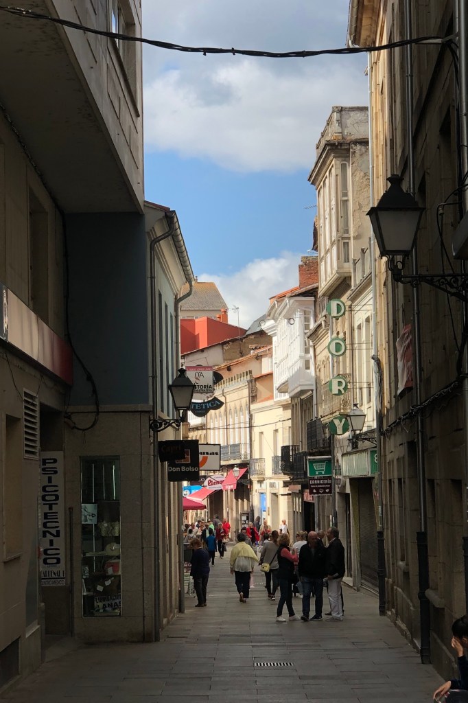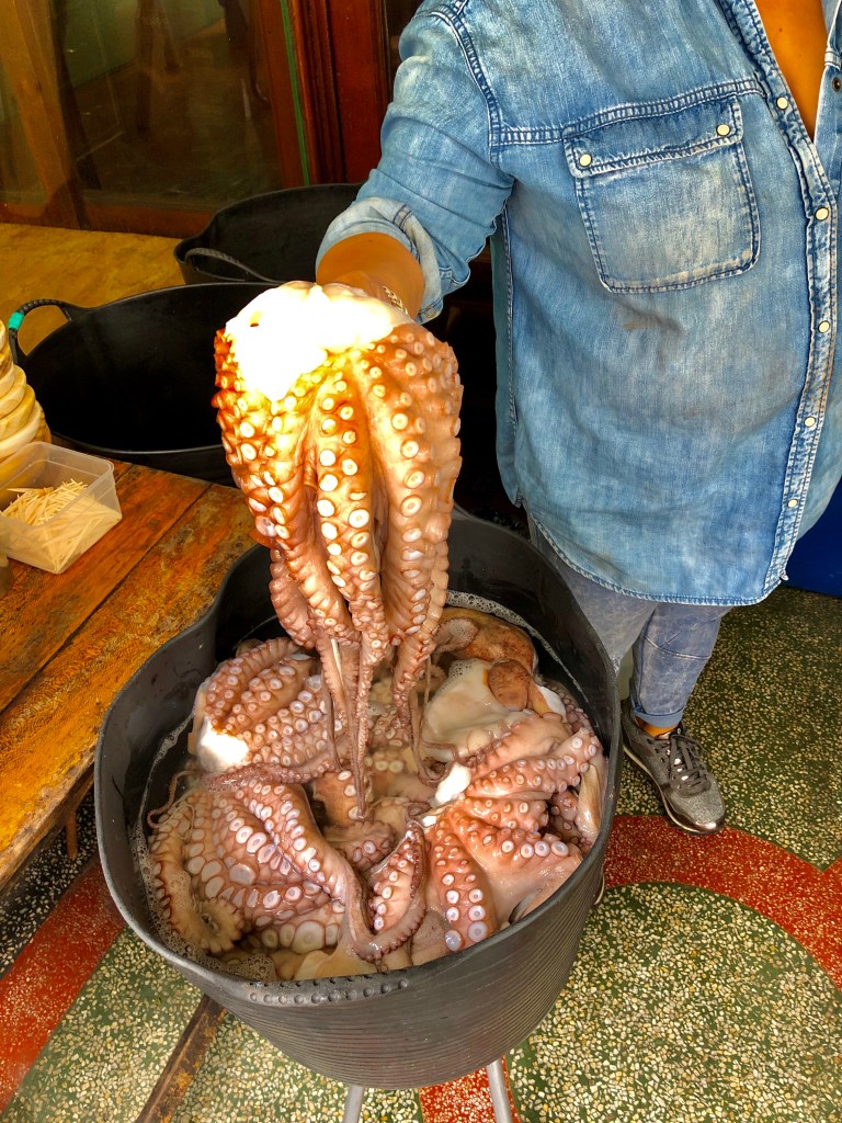 It is mid-morning now and when I reach the city center it’s busy with shoppers, a few tourists, a lively coffee shop vibe, plus one lonely pilgrim. I thought that perhaps here – one of the larger places I’d crossed – I might encounter someone else burdened with a backpack and hiking poles, but not a one in sight. I’m tempted to enjoy one more “cafe con leche” before moving on, in part to people-watch since I’d seen so few in the past week, but I’ve already had two back at the hotel, so I move on. The staple dish of Galicia is “pulpo,” octopus, so I can’t resist snapping a photo of the bucket of these tentacled creatures – decapitated by now – being prepared for the pot in one of the outdoor “pulperias” that line the market street. By lunchtime – 1pm – they’ll be ready.