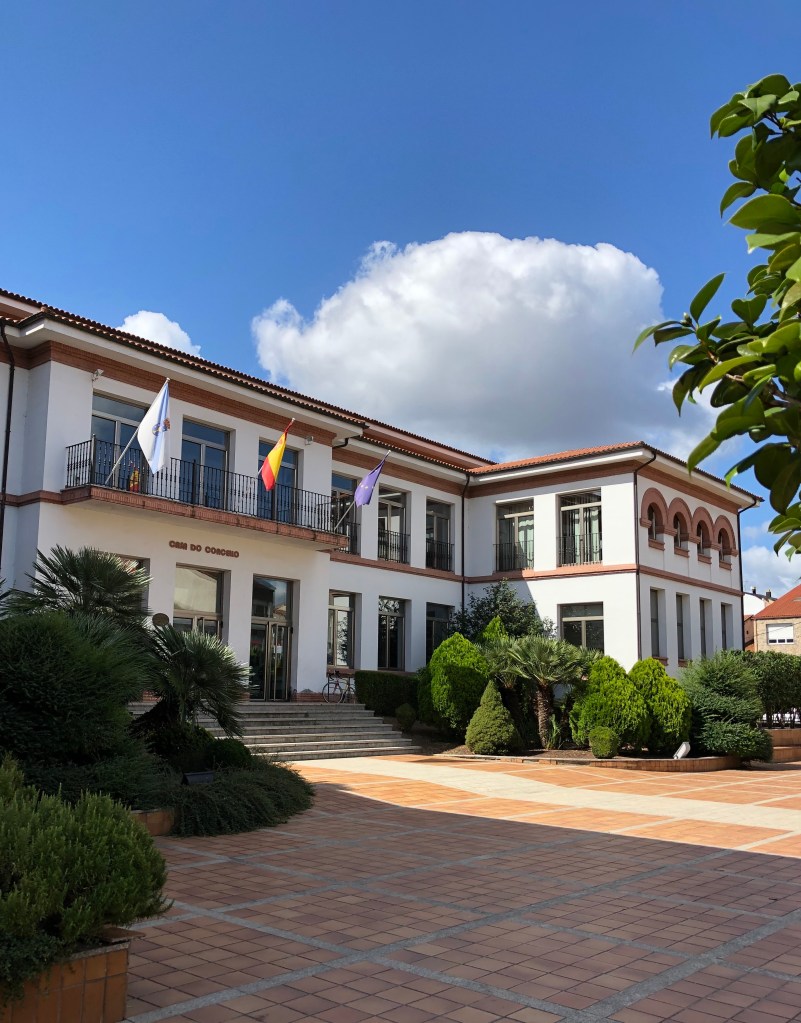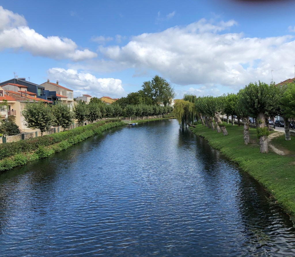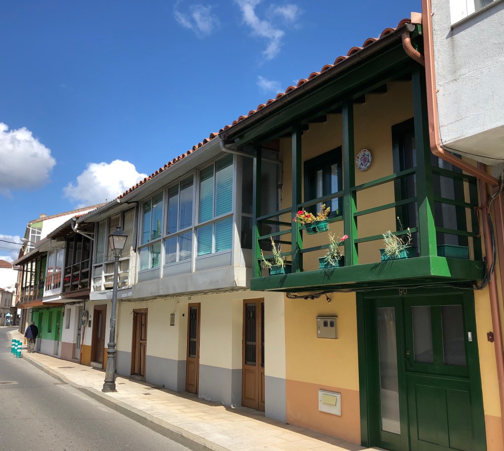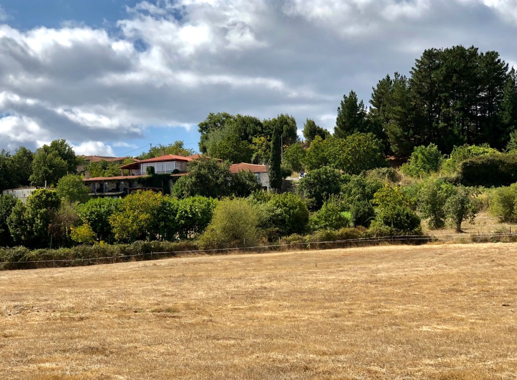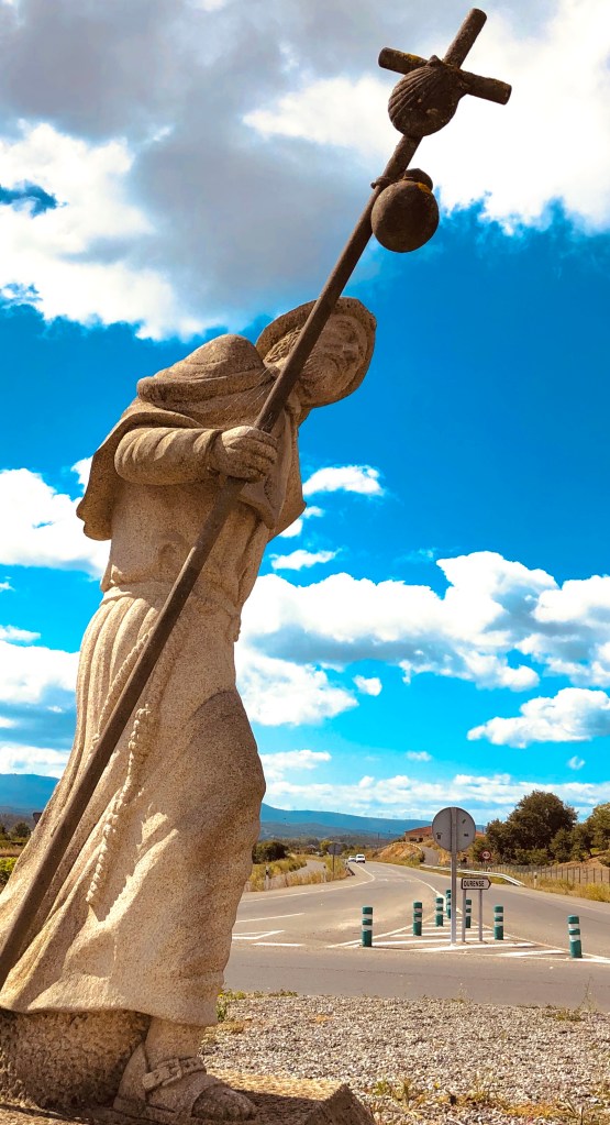 Then I cross the classic Roman bridge that spans the Rio Cabe, beyond which sits the majestic “Convento das Clarisas de Monforte,” another repurposed convent that now serves as a history and art museum. A short way further on is the attractive contemporary “Casa de Concello,” the city hall, and then I walk along a tidy residential street exhibiting a variety of interpretations of classic regional architecture featuring the 1st floor (in the US we say 2nd floor) balcony or enclosed sun-room. At the end of that long street, as it transitions into the outskirts, stands a monument to the medieval pilgrim. He carries a staff topped by a cross as a walking aid, and attached to it are the scallop shell emblem of Saint James (one is attached to my pack as well) and a drinking gourd for his water. The monument is a reminder to this modern-day counterpart that the luxury of the night before was unimaginable to him a thousand years ago.