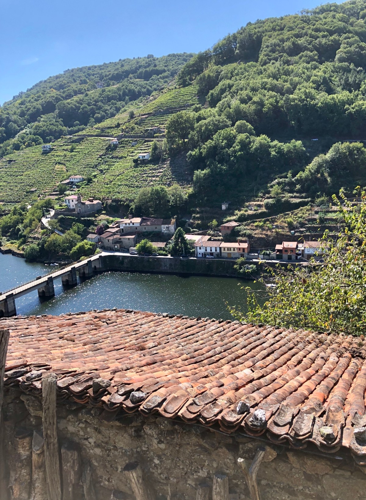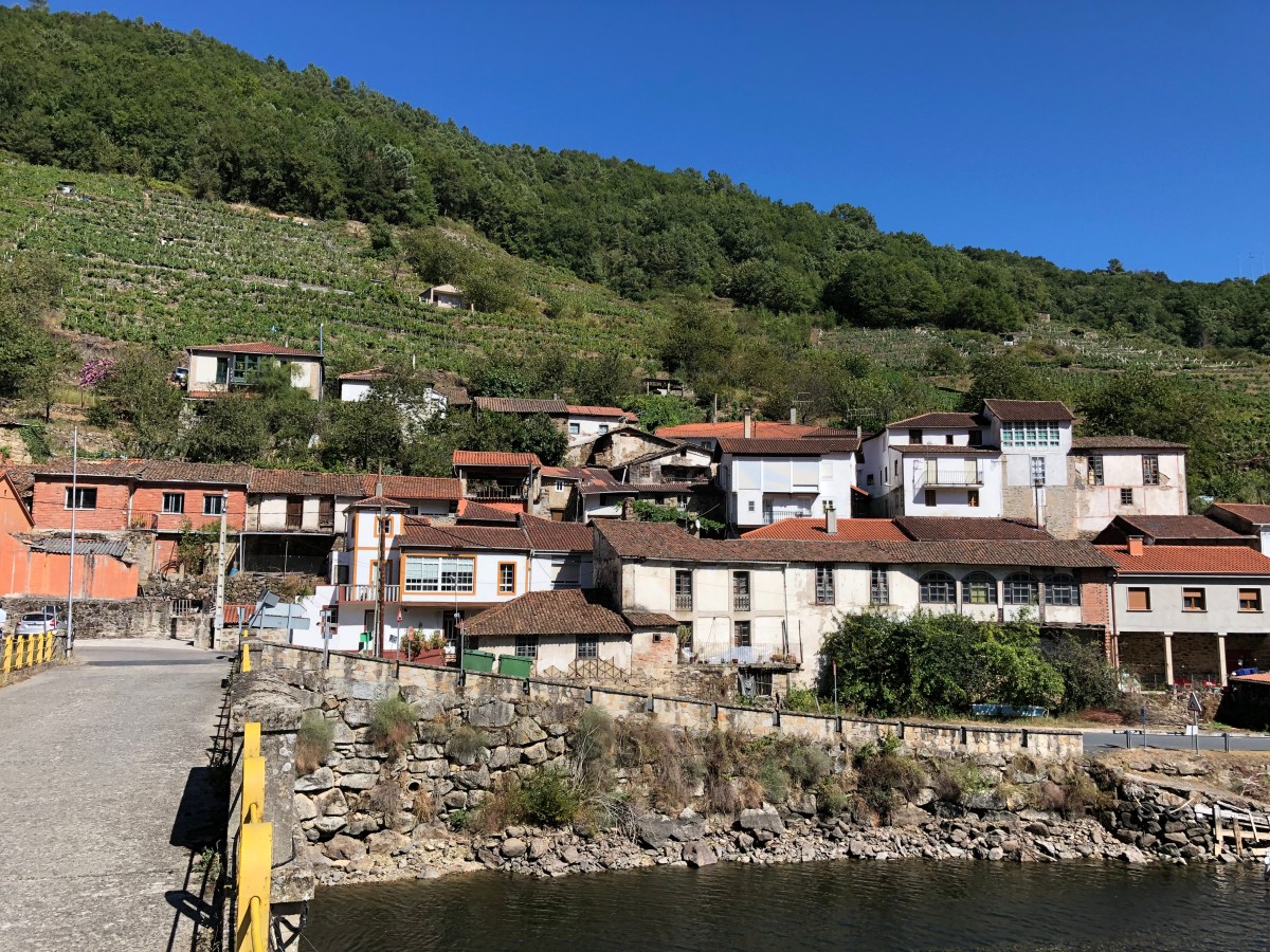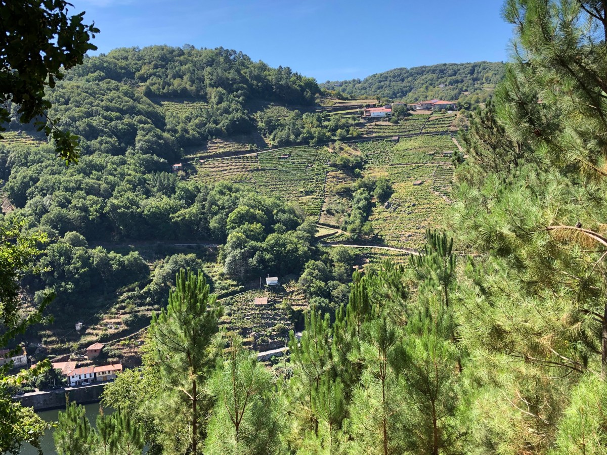 Soon after leaving this area, the trail descends at a steadily increasing steeper slope, but the trail surface is unforgivingly rough Roman road. The rounded granite stones are like anvils upon which each step of my feet is a hammer blow as gravity pulls on my backpack-burdened body, 13% heavier than my true weight. The pain shudders from my feet up through my body. On this surface the use of hiking poles is essential. They brake my downward acceleration and they stabilize the precariousness of setting each footstep on an uneven hard surface. It continues like this for an excruciatingly long distance through a dense forest. Eventually it opens up to the first glimpse of what lies ahead: the continuing steep descent to the Rio Mino, the village of Belesar that spans both banks, and the equally steep ascent through vineyards that still awaits before this day is over.