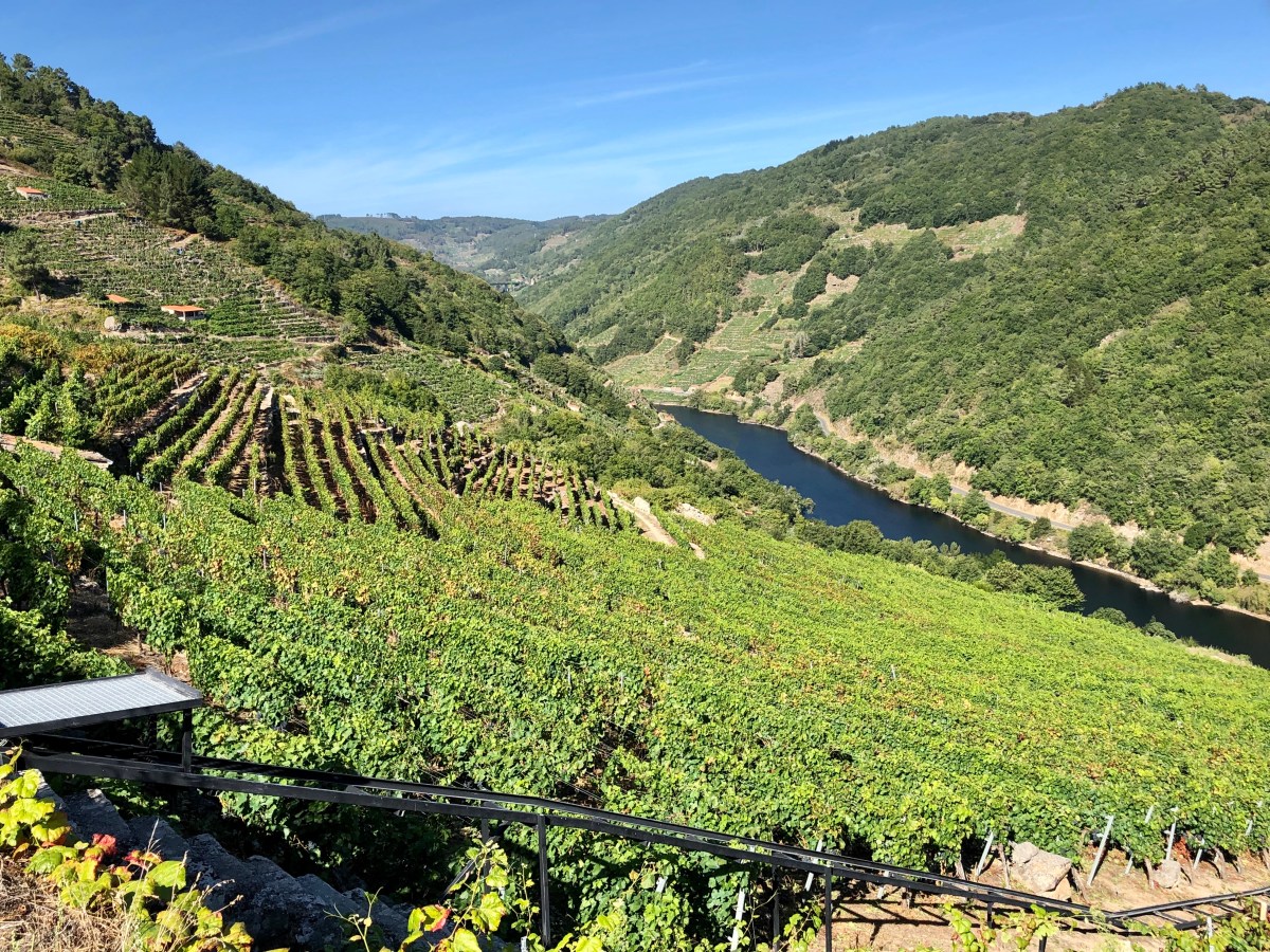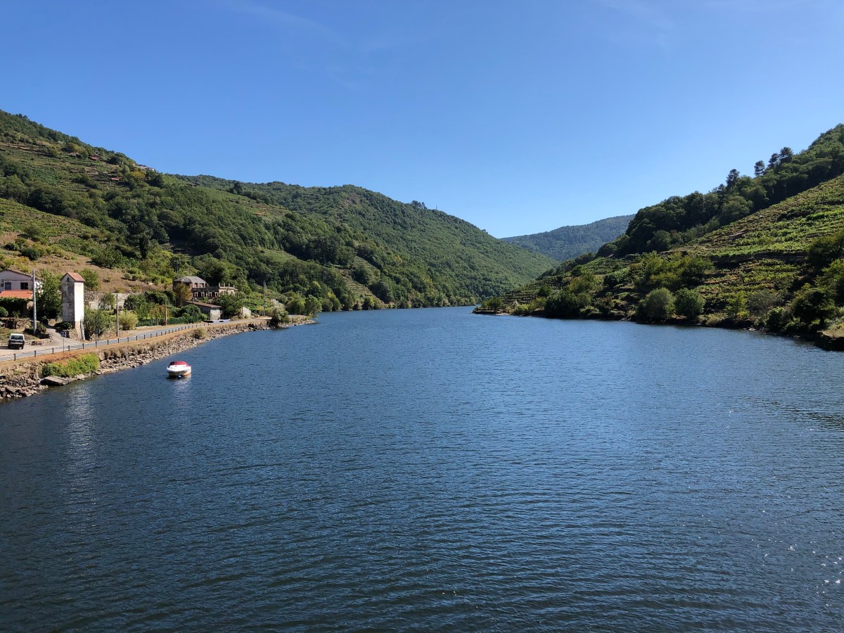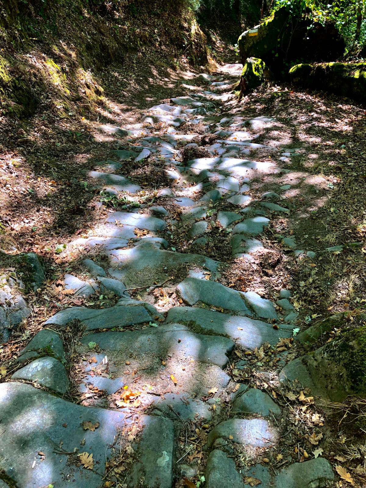 Soon after leaving this area, the trail descends at a steadily increasing steeper slope, but the trail surface is unforgivingly rough Roman road. The rounded granite stones are like anvils upon which each step of my feet is a hammer blow as gravity pulls on my backpack-burdened body, 13% heavier than my true weight. The pain shudders from my feet up through my body. On this surface the use of hiking poles is essential. They brake my downward acceleration and they stabilize the precariousness of setting each footstep on an uneven hard surface. It continues like this for an excruciatingly long distance through a dense forest. Eventually it opens up to the first glimpse of what lies ahead: the continuing steep descent to the Rio Mino, the village of Belesar that spans both banks, and the equally steep ascent through vineyards that still awaits before this day is over.