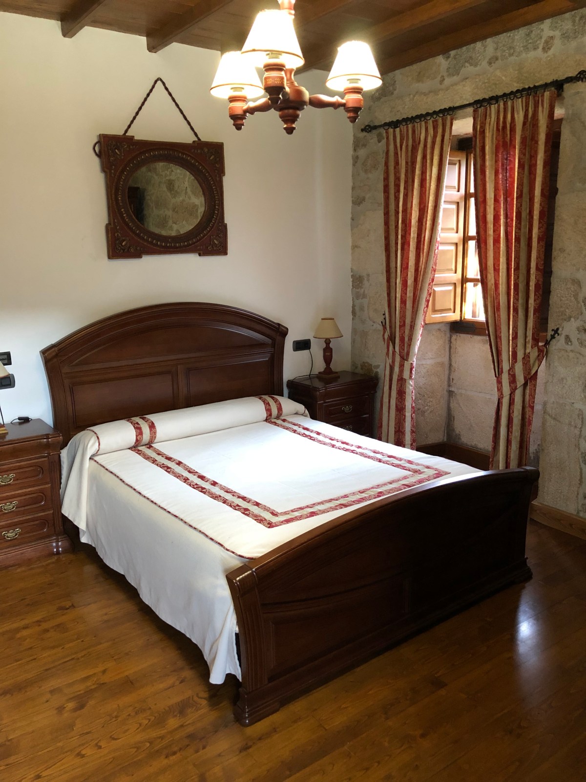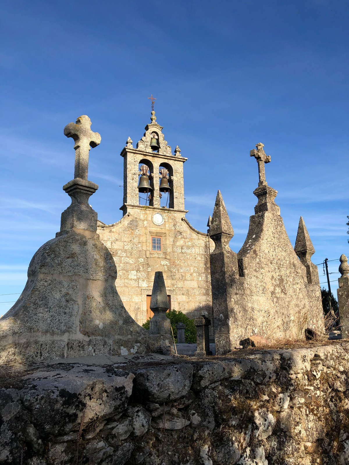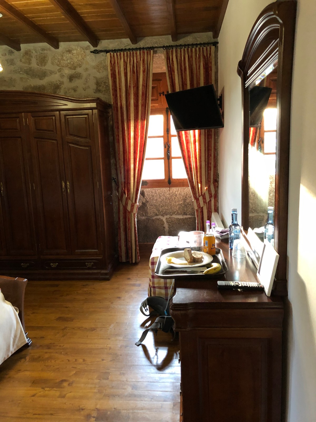 I had booked myself in what I thought was a simple B&B on the outskirts of town. Around 6pm, I see a message on my phone, in Spanish, asking when I’m arriving at the Pazo do Pineiro. After consulting my map, I estimate it’ll be another hour or so and respond accordingly. A minute later I receive another message that this will be too late; I need to arrive earlier. I write that I’m arriving on foot, I can’t go faster (In Spanish, mind you. Thank God for Google Translate.). Now my correspondent says she’ll pick me up… where am I? Thankfully I’m at a landmark, a church, and I tell her I’ll wait there. It’s against my purist instinct – I want to walk, not ride – and while I sit there I wonder why a 7 or 7:30 arrival is considered “too late” in Spain, of all places, where that’s considered early. The answer comes after my arrival – by Mercedes – a short while later. I’m the only guest, once again, in a small palace-like B&B and my hostess has other plans for the evening. She does bring me a plate of bread, cheese and ham, plus an apple, but then I’m totally alone in this spacious room in grey stone palace. WiFi signals don’t penetrate those walls, so I’m cut off from the world, leaving me no choice but to fall into bed. It’s a good thing the difficulty of the day had taken its toll. Sleep comes easily.