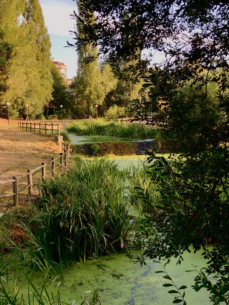 It started, though, in a way I hadn’t expected. Walking through Lalin late the previous day there was nothing distinctive about the city. I concluded it was a forgettable place. That opinion carried into this sunny Saturday morning. Leaving the hotel, the path led me for about 1km on sidewalks heading toward a two-story shopping center, but before reaching it a sign directed me down an embankment to the “Paseo Fluvial del Rio Pontinas.” What a delightful surprise! My hometown of Boise, Idaho has a very long paved pathway following the Boise River that meanders through the city. I suspect that most cities along rivers have something similar, but I’m particularly fond of Boise’s for its peaceful atmosphere, the diversity of vegetation and even wildlife. Lalin’s “Paseo Fluvial” quickly captivated me and won over my heart as one of the prettiest such river walks I’d ever been on, rivaling the one back home.