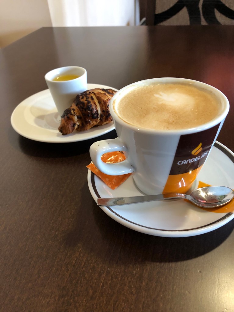 What greeted me first was a modern, multi-story hotel that I might’ve expected to see in the heart of the city. Instead it stood on a grassy island next to a heavily-traveled highway. As I had skipped breakfast earlier, I took advantage of this place and went into its main-floor coffee shop to enjoy my staple “cafe con leche” with a buttery croissant and Seville orange marmalade. After a very pleasant rest, I started walking again, and soon found myself in an industrial park in what I realized was the town of A Laxe. It no longer looked or felt like a Spanish town, but rather a harsh jumble of glass, aluminum and brick modernity. Most surprising of all in this stark setting was a simple marker by the side of the road declaring this to be the end of the Camino Invierno. I was so shocked that I didn’t even get a photo.