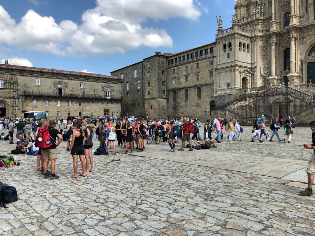 Pilgrims cluster in groups in the Praza do Obraido facing the Cathedral of Santiago de Compostela after arriving at this endpoint to the numerous Caminos that cross Spain, Portugal and even France.